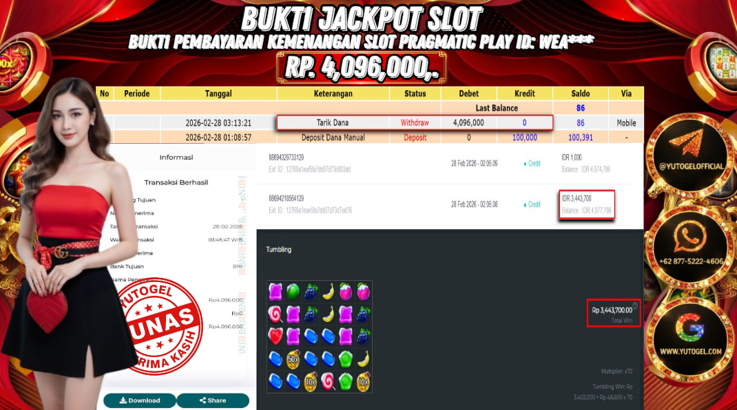 Selamat kepada USER ID : WEA*** Telah berhasil mendapatkan kemenangan besar pada YUTOGEL JACKPOT PRAGMATIC PLAY SWEET BONANZA XMAS RP. 4.096.000,. – LUNAS. Setelah mengisi formulir withdraw dengan kurung waktu hanya 5 – 10 menit pihak sudah melakukan transfer kepada pemilik User id dan dana sudah dapat dicairkan oleh pemenang. Bukti pembayaran yang kami berikan merupakan bukti pembayaran yang SAH/VALID yang langsung di dapatkan melalui tanda transfer transaksi dari Bank yang dituju.