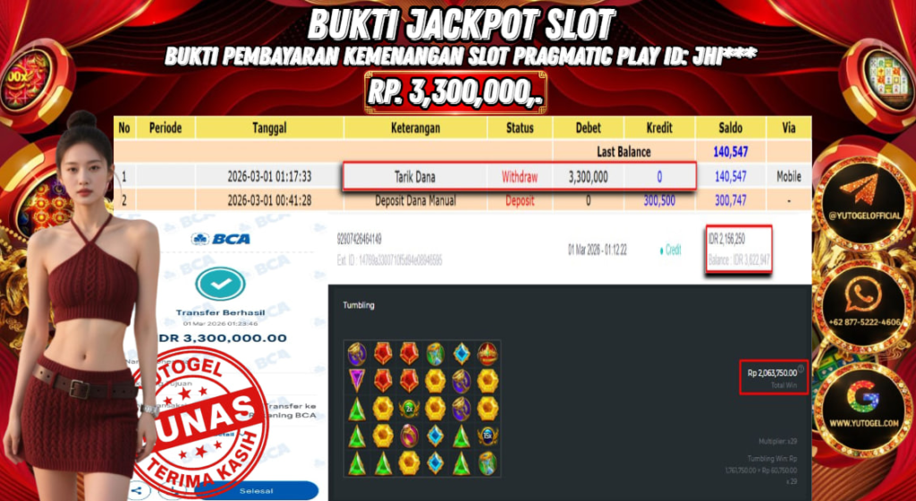 Selamat kepada USER ID : JHI*** Telah berhasil mendapatkan kemenangan besar pada YUTOGEL JACKPOT PRAGMATIC PLAY GATES OF OLYMPUS RP. 3.300.000,. – LUNAS. Setelah mengisi formulir withdraw dengan kurung waktu hanya 5 – 10 menit pihak  sudah melakukan transfer kepada pemilik User id dan dana sudah dapat dicairkan oleh pemenang. Bukti pembayaran yang kami berikan merupakan bukti pembayaran yang SAH/VALID yang langsung di dapatkan melalui tanda transfer transaksi dari Bank yang dituju.