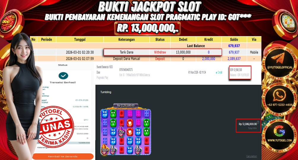 Selamat kepada USER ID : GOT*** Telah berhasil mendapatkan kemenangan besar pada YUTOGEL JACKPOT PRAGMATIC PLAY SWEET BONANZA 1000 DICE RP. 13.000.000,. – LUNAS. Setelah mengisi formulir withdraw dengan kurung waktu hanya 5 – 10 menit pihak sudah melakukan transfer kepada pemilik User id dan dana sudah dapat dicairkan oleh pemenang. Bukti pembayaran yang kami berikan merupakan bukti pembayaran yang SAH/VALID yang langsung di dapatkan melalui tanda transfer transaksi dari Bank yang dituju.