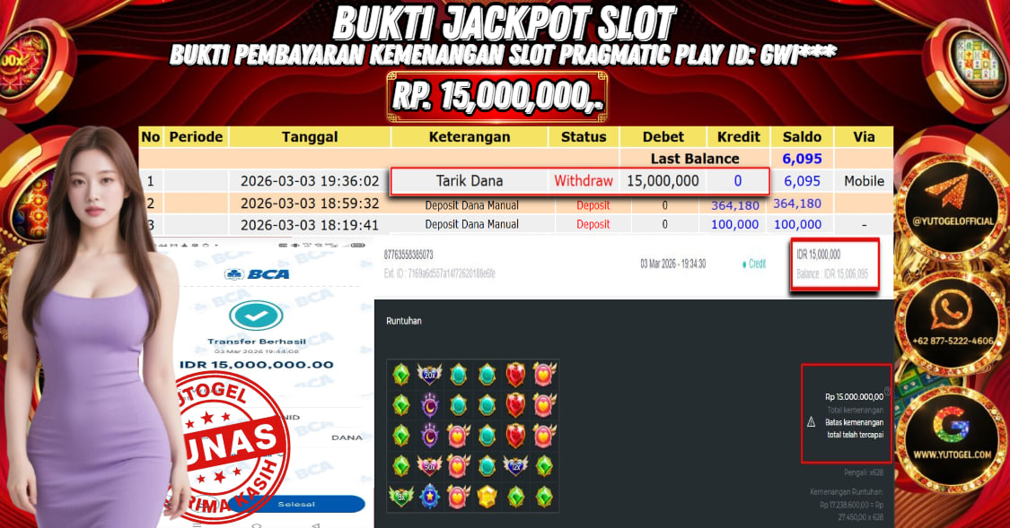 Selamat kepada USER ID : GWI*** Telah berhasil mendapatkan kemenangan besar pada YUTOGEL JACKPOT PRAGMATIC PLAY STARLIGHT PRINCESS 1000 DICE RP. 15.000.000,. – LUNAS. Setelah mengisi formulir withdraw dengan kurung waktu hanya 5 – 10 menit pihak sudah melakukan transfer kepada pemilik User id dan dana sudah dapat dicairkan oleh pemenang. Bukti pembayaran yang kami berikan merupakan bukti pembayaran yang SAH/VALID yang langsung di dapatkan melalui tanda transfer transaksi dari Bank yang dituju.