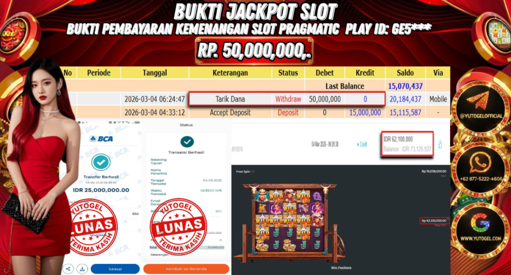 Selamat kepada USER ID : GE5*** Telah berhasil mendapatkan kemenangan besar pada YUTOGEL JACKPOT PRAGMATIC PLAY WILD WEST GOLD RP. 50.000.000,. – LUNAS. Setelah mengisi formulir withdraw dengan kurung waktu hanya 5 – 10 menit pihak sudah melakukan transfer kepada pemilik User id dan dana sudah dapat dicairkan oleh pemenang. Bukti pembayaran yang kami berikan merupakan bukti pembayaran yang SAH/VALID yang langsung di dapatkan melalui tanda transfer transaksi dari Bank yang dituju.
