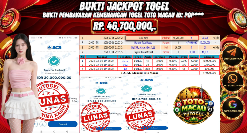 Selamat kepada USER ID : POP*** Telah berhasil mendapatkan kemenangan besar pada YUTOGEL JACKPOT TOGEL TOTO MACAU RP. 46.700.000,. – LUNAS. Setelah mengisi formulir withdraw dengan kurung waktu hanya 5 – 10 menit pihak  sudah melakukan transfer kepada pemilik User id dan dana sudah dapat dicairkan oleh pemenang. Bukti pembayaran yang kami berikan merupakan bukti pembayaran yang SAH/VALID yang langsung di dapatkan melalui tanda transfer transaksi dari Bank yang dituju.