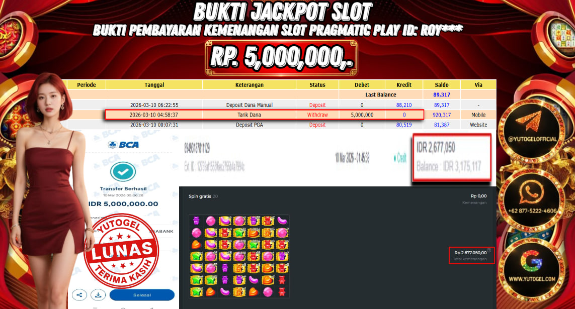 Selamat kepada USER ID : ROY*** Telah berhasil mendapatkan kemenangan besar pada YUTOGEL JACKPOT PRAGMATIC PLAY SUGAR RUSH1000 RP. 5.000.000,. – LUNAS. Setelah mengisi formulir withdraw dengan kurung waktu hanya 5 – 10 menit pihak sudah melakukan transfer kepada pemilik User id dan dana sudah dapat dicairkan oleh pemenang. Bukti pembayaran yang kami berikan merupakan bukti pembayaran yang SAH/VALID yang langsung di dapatkan melalui tanda transfer transaksi dari Bank yang dituju.