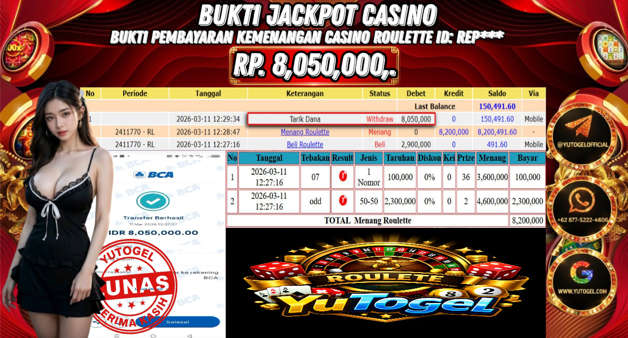 Selamat kepada USER ID : REP*** Telah berhasil mendapatkan kemenangan besar pada YUTOGEL JACKPOT CASINO ROULETTE RP. 9.050.000,. – LUNAS. Setelah mengisi formulir withdraw dengan kurung waktu hanya 5 – 10 menit pihak sudah melakukan transfer kepada pemilik User id dan dana sudah dapat dicairkan oleh pemenang. Bukti pembayaran yang kami berikan merupakan bukti pembayaran yang SAH/VALID yang langsung di dapatkan melalui tanda transfer transaksi dari Bank yang dituju.