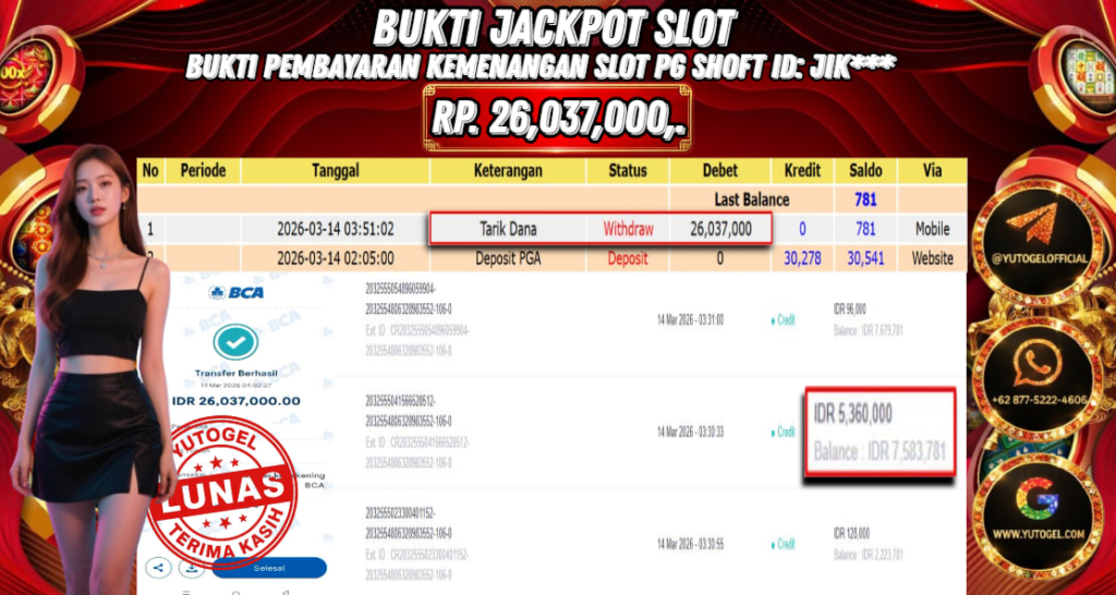 Selamat kepada USER ID : JIK*** Telah berhasil mendapatkan kemenangan besar pada YUTOGEL JACKPOT PG SHOFT MAHJONG WAYS2 RP. 26.037.000,. – LUNAS. Setelah mengisi formulir withdraw dengan kurung waktu hanya 5 – 10 menit pihak sudah melakukan transfer kepada pemilik User id dan dana sudah dapat dicairkan oleh pemenang. Bukti pembayaran yang kami berikan merupakan bukti pembayaran yang SAH/VALID yang langsung di dapatkan melalui tanda transfer transaksi dari Bank yang dituju.