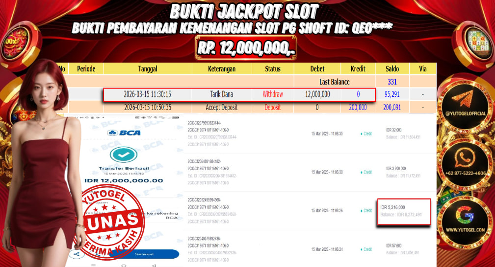 Selamat kepada USER ID : QEO*** Telah berhasil mendapatkan kemenangan besar pada YUTOGEL JACKPOT PG SHOFT TREASURE OF AZTEC RP. 12.000.000,. – LUNAS. Setelah mengisi formulir withdraw dengan kurung waktu hanya 5 – 10 menit pihak sudah melakukan transfer kepada pemilik User id dan dana sudah dapat dicairkan oleh pemenang. Bukti pembayaran yang kami berikan merupakan bukti pembayaran yang SAH/VALID yang langsung di dapatkan melalui tanda transfer transaksi dari Bank yang dituju.