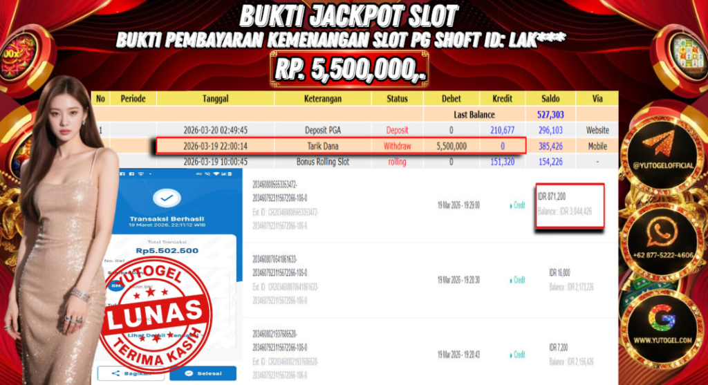 Selamat kepada USER ID : LAK*** Telah berhasil mendapatkan kemenangan besar pada YUTOGEL JACKPOT PG SHOFT TREASURE OF AZTEC RP. 5.500.000,. – LUNAS. Setelah mengisi formulir withdraw dengan kurung waktu hanya 5 – 10 menit pihak sudah melakukan transfer kepada pemilik User id dan dana sudah dapat dicairkan oleh pemenang. Bukti pembayaran yang kami berikan merupakan bukti pembayaran yang SAH/VALID yang langsung di dapatkan melalui tanda transfer transaksi dari Bank yang dituju.