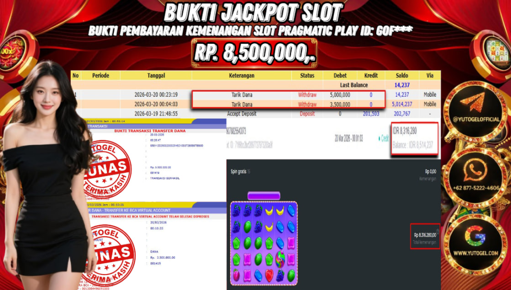 Selamat kepada USER ID : GOF*** Telah berhasil mendapatkan kemenangan besar pada YUTOGEL JACKPOT PRAGMATIC PLAY SWEET BONANZA1000 RP. 8.500.000,. – LUNAS. Setelah mengisi formulir withdraw dengan kurung waktu hanya 5 – 10 menit pihak sudah melakukan transfer kepada pemilik User id dan dana sudah dapat dicairkan oleh pemenang. Bukti pembayaran yang kami berikan merupakan bukti pembayaran yang SAH/VALID yang langsung di dapatkan melalui tanda transfer transaksi dari Bank yang dituju.