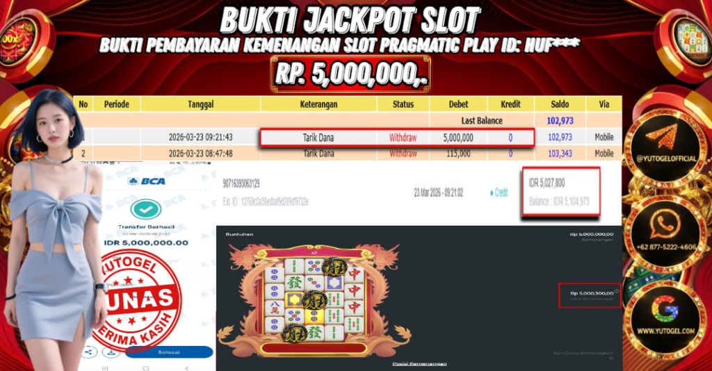 Selamat kepada USER ID : HUF*** Telah berhasil mendapatkan kemenangan besar pada YUTOGEL JACKPOT PRAGMATIC PLAY MAHJONG WINS 3 BLACK SCATER RP. 5.000.000,. – LUNAS. Setelah mengisi formulir withdraw dengan kurung waktu hanya 5 – 10 menit pihak sudah melakukan transfer kepada pemilik User id dan dana sudah dapat dicairkan oleh pemenang. Bukti pembayaran yang kami berikan merupakan bukti pembayaran yang SAH/VALID yang langsung di dapatkan melalui tanda transfer transaksi dari Bank yang dituju.
