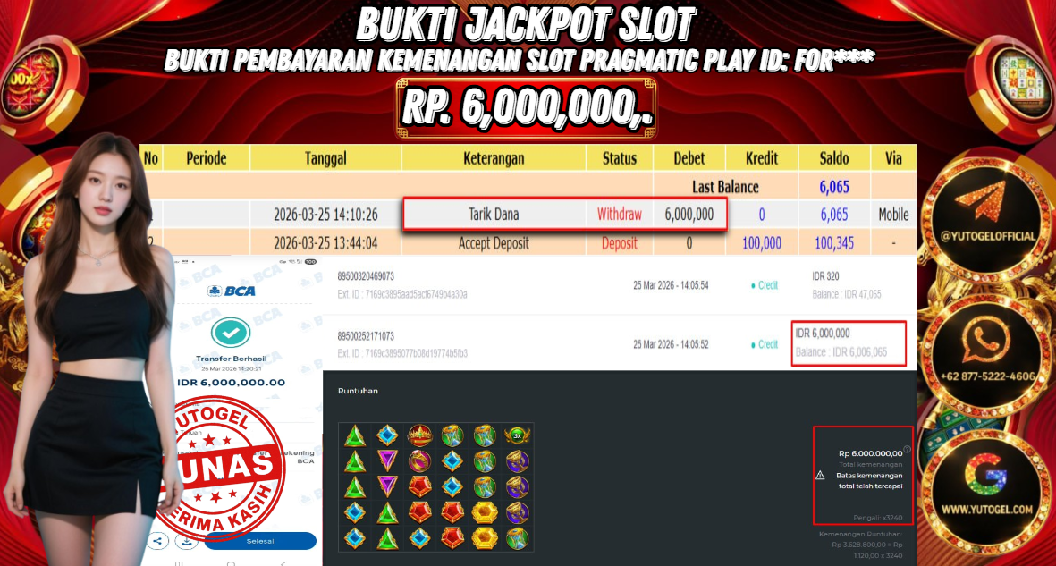 Selamat kepada USER ID : FOR*** Telah berhasil mendapatkan kemenangan besar pada YUTOGEL JACKPOT PRAGMATIC PLAY GATES OF OLYMPUS RP. 6.000.000,. – LUNAS. Setelah mengisi formulir withdraw dengan kurung waktu hanya 5 – 10 menit pihak  sudah melakukan transfer kepada pemilik User id dan dana sudah dapat dicairkan oleh pemenang. Bukti pembayaran yang kami berikan merupakan bukti pembayaran yang SAH/VALID yang langsung di dapatkan melalui tanda transfer transaksi dari Bank yang dituju.