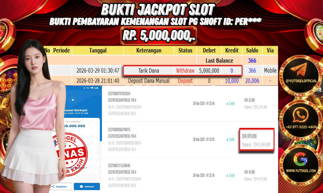 Selamat kepada USER ID : PER*** Telah berhasil mendapatkan kemenangan besar pada YUTOGEL JACKPOT PG SHOFT TREASURE OF AZTEC RP. 5.000.000,. – LUNAS. Setelah mengisi formulir withdraw dengan kurung waktu hanya 5 – 10 menit pihak sudah melakukan transfer kepada pemilik User id dan dana sudah dapat dicairkan oleh pemenang. Bukti pembayaran yang kami berikan merupakan bukti pembayaran yang SAH/VALID yang langsung di dapatkan melalui tanda transfer transaksi dari Bank yang dituju.