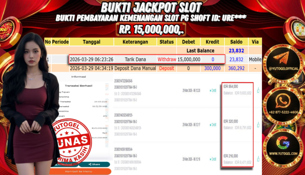 Selamat kepada USER ID : URE*** Telah berhasil mendapatkan kemenangan besar pada YUTOGEL JACKPOT PG SHOFT WILD BOUNTY SHOWDOWN RP. 15.000.000,. – LUNAS. Setelah mengisi formulir withdraw dengan kurung waktu hanya 5 – 10 menit pihak sudah melakukan transfer kepada pemilik User id dan dana sudah dapat dicairkan oleh pemenang. Bukti pembayaran yang kami berikan merupakan bukti pembayaran yang SAH/VALID yang langsung di dapatkan melalui tanda transfer transaksi dari Bank yang dituju.