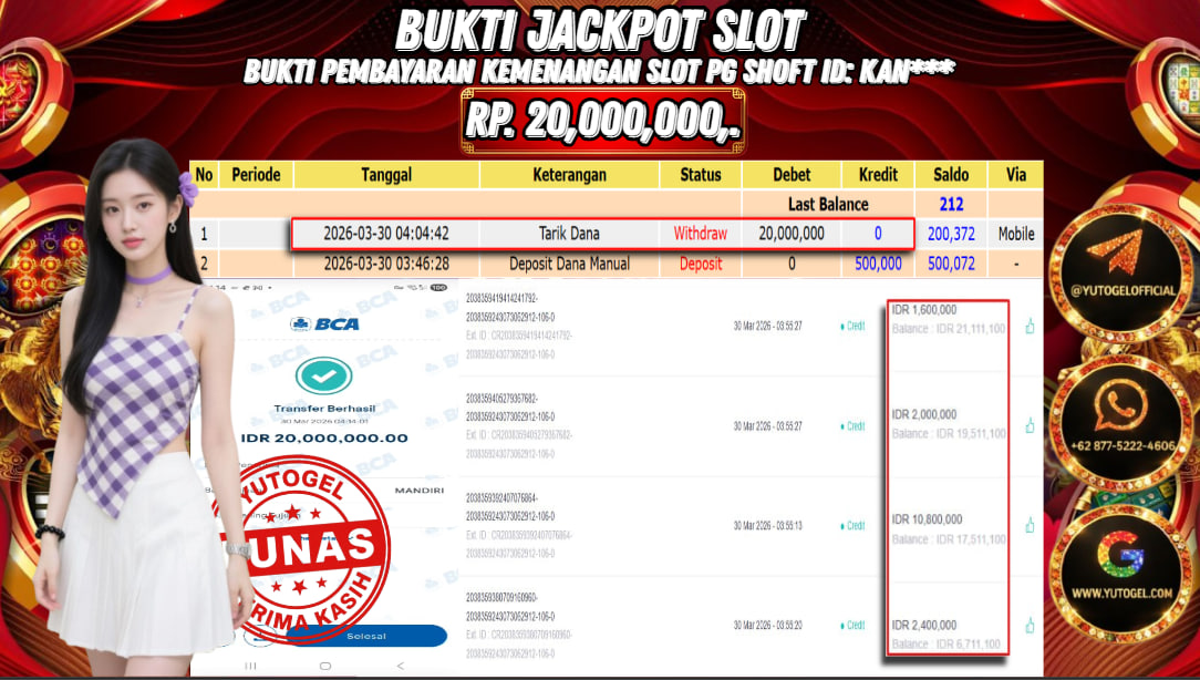 Selamat kepada USER ID : KAN*** Telah berhasil mendapatkan kemenangan besar pada YUTOGEL JACKPOT PG SHOFT WILD BOUNTY SHOWDOWN RP. 20.000.000,. – LUNAS. Setelah mengisi formulir withdraw dengan kurung waktu hanya 5 – 10 menit pihak sudah melakukan transfer kepada pemilik User id dan dana sudah dapat dicairkan oleh pemenang. Bukti pembayaran yang kami berikan merupakan bukti pembayaran yang SAH/VALID yang langsung di dapatkan melalui tanda transfer transaksi dari Bank yang dituju.