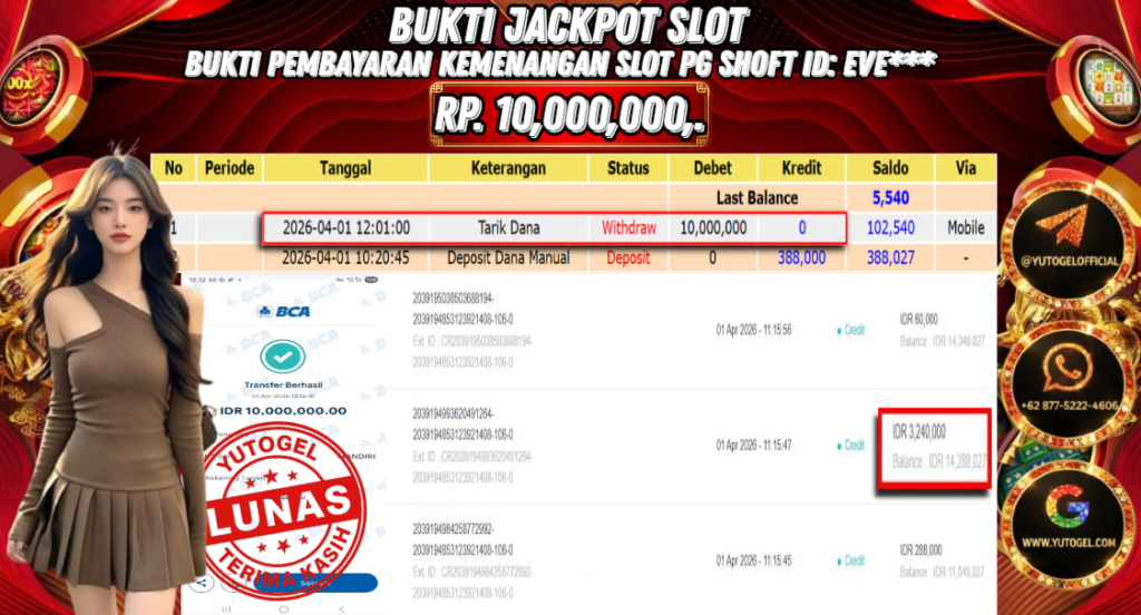 Selamat kepada USER ID : EVE*** Telah berhasil mendapatkan kemenangan besar pada YUTOGEL JACKPOT PG SHOFT WILD BOUNTY SHOWDOWN RP. 10.000.000,. – LUNAS. Setelah mengisi formulir withdraw dengan kurung waktu hanya 5 – 10 menit pihak sudah melakukan transfer kepada pemilik User id dan dana sudah dapat dicairkan oleh pemenang. Bukti pembayaran yang kami berikan merupakan bukti pembayaran yang SAH/VALID yang langsung di dapatkan melalui tanda transfer transaksi dari Bank yang dituju.