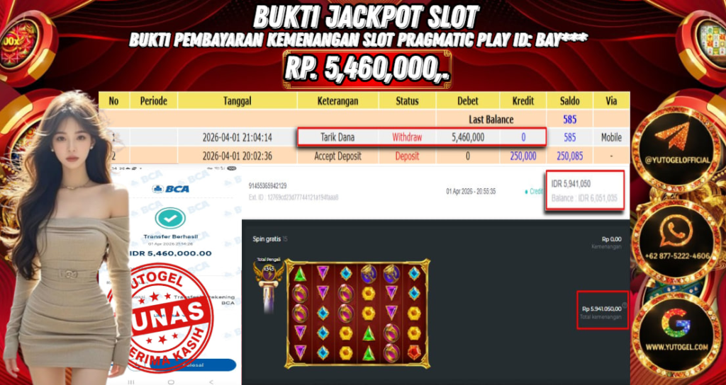 Selamat kepada USER ID : BAY*** Telah berhasil mendapatkan kemenangan besar pada YUTOGEL JACKPOT PRAGMATIC PLAY GATES OF OLYMPUS1000 RP. 5.460.000,. – LUNAS. Setelah mengisi formulir withdraw dengan kurung waktu hanya 5 – 10 menit pihak  sudah melakukan transfer kepada pemilik User id dan dana sudah dapat dicairkan oleh pemenang. Bukti pembayaran yang kami berikan merupakan bukti pembayaran yang SAH/VALID yang langsung di dapatkan melalui tanda transfer transaksi dari Bank yang dituju.