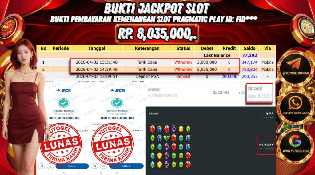 Selamat kepada USER ID : FID*** Telah berhasil mendapatkan kemenangan besar pada YUTOGEL JACKPOT PRAGMATIC PLAY STARLIGHT PRINCESS1000 RP. 8.035.000,. – LUNAS. Setelah mengisi formulir withdraw dengan kurung waktu hanya 5 – 10 menit pihak sudah melakukan transfer kepada pemilik User id dan dana sudah dapat dicairkan oleh pemenang. Bukti pembayaran yang kami berikan merupakan bukti pembayaran yang SAH/VALID yang langsung di dapatkan melalui tanda transfer transaksi dari Bank yang dituju.