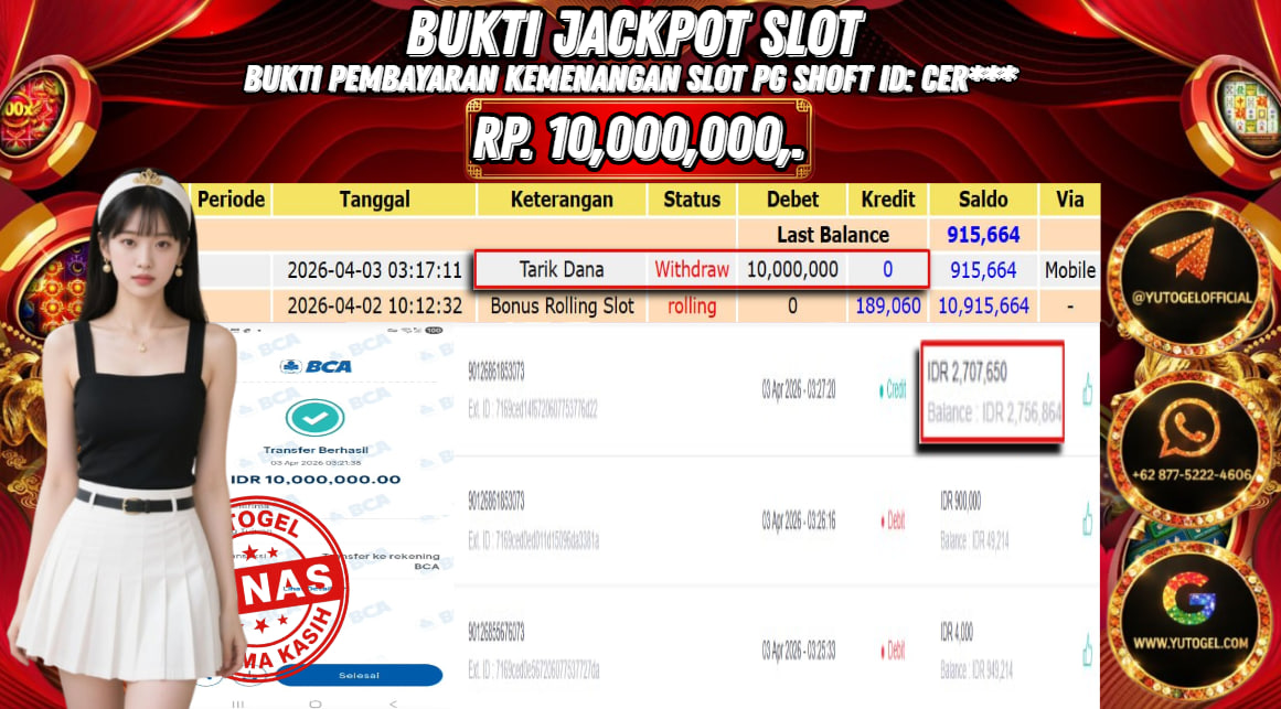 Selamat kepada USER ID : CER*** Telah berhasil mendapatkan kemenangan besar pada YUTOGEL JACKPOT PG SHOFT MAHJONG WAYS RP. 10.000.000,. – LUNAS. Setelah mengisi formulir withdraw dengan kurung waktu hanya 5 – 10 menit pihak  sudah melakukan transfer kepada pemilik User id dan dana sudah dapat dicairkan oleh pemenang. Bukti pembayaran yang kami berikan merupakan bukti pembayaran yang SAH/VALID yang langsung di dapatkan melalui tanda transfer transaksi dari Bank yang dituju.