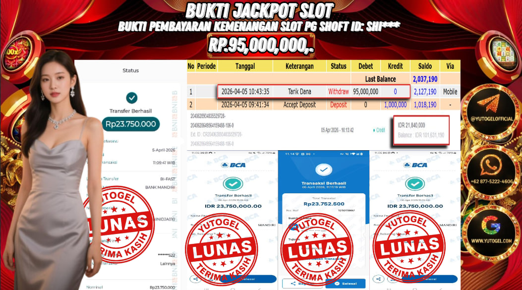 Selamat kepada USER ID : SHI*** Telah berhasil mendapatkan kemenangan besar pada YUTOGEL JACKPOT PG SHOFT MAHJONG WAYS RP. 95.000.000,. – LUNAS. Setelah mengisi formulir withdraw dengan kurung waktu hanya 5 – 10 menit pihak  sudah melakukan transfer kepada pemilik User id dan dana sudah dapat dicairkan oleh pemenang. Bukti pembayaran yang kami berikan merupakan bukti pembayaran yang SAH/VALID yang langsung di dapatkan melalui tanda transfer transaksi dari Bank yang dituju.