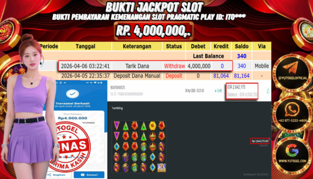 Selamat kepada USER ID : ITO*** Telah berhasil mendapatkan kemenangan besar pada YUTOGEL JACKPOT PRAGMATIC PLAY GATES OF OLYMPUS RP. 4.000.000,. – LUNAS. Setelah mengisi formulir withdraw dengan kurung waktu hanya 5 – 10 menit pihak sudah melakukan transfer kepada pemilik User id dan dana sudah dapat dicairkan oleh pemenang. Bukti pembayaran yang kami berikan merupakan bukti pembayaran yang SAH/VALID yang langsung di dapatkan melalui tanda transfer transaksi dari Bank yang dituju.