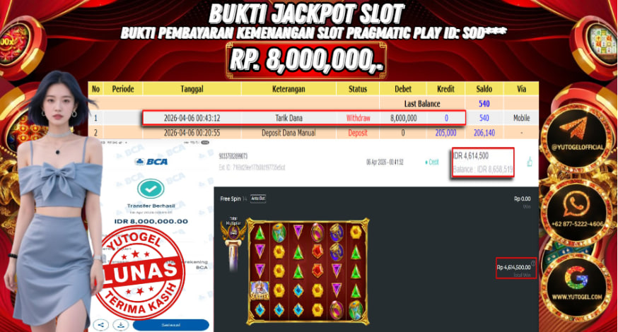 Selamat kepada USER ID : SOD*** Telah berhasil mendapatkan kemenangan besar pada YUTOGEL JACKPOT PRAGMATIC PLAY GATES OF OLYMPUS1000 RP. 8.000.000,. – LUNAS. Setelah mengisi formulir withdraw dengan kurung waktu hanya 5 – 10 menit pihak sudah melakukan transfer kepada pemilik User id dan dana sudah dapat dicairkan oleh pemenang. Bukti pembayaran yang kami berikan merupakan bukti pembayaran yang SAH/VALID yang langsung di dapatkan melalui tanda transfer transaksi dari Bank yang dituju.