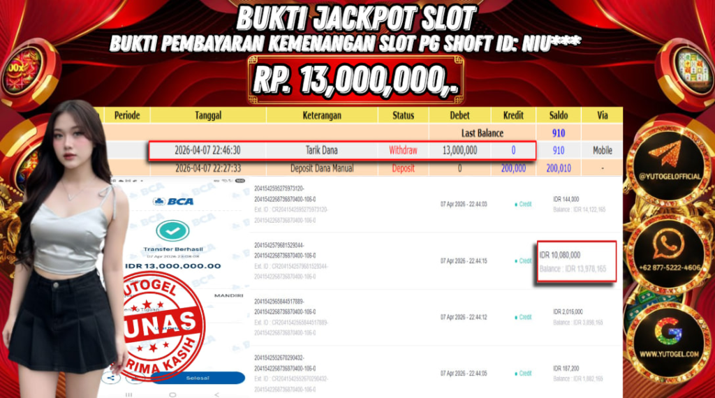 Selamat kepada USER ID : NIU*** Telah berhasil mendapatkan kemenangan besar pada YUTOGEL JACKPOT PG SHOFT MAHJONG WAYS RP. 13.000.000,. – LUNAS. Setelah mengisi formulir withdraw dengan kurung waktu hanya 5 – 10 menit pihak sudah melakukan transfer kepada pemilik User id dan dana sudah dapat dicairkan oleh pemenang. Bukti pembayaran yang kami berikan merupakan bukti pembayaran yang SAH/VALID yang langsung di dapatkan melalui tanda transfer transaksi dari Bank yang dituju.