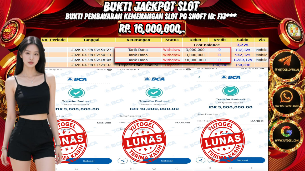Selamat kepada USER ID : FIJ*** Telah berhasil mendapatkan kemenangan besar pada YUTOGEL JACKPOT PG SHOFT MAHJONG WAYS RP. 16.000.000,. – LUNAS. Setelah mengisi formulir withdraw dengan kurung waktu hanya 5 – 10 menit pihak  sudah melakukan transfer kepada pemilik User id dan dana sudah dapat dicairkan oleh pemenang. Bukti pembayaran yang kami berikan merupakan bukti pembayaran yang SAH/VALID yang langsung di dapatkan melalui tanda transfer transaksi dari Bank yang dituju.