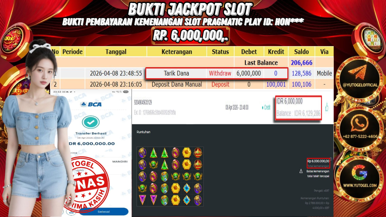 Selamat kepada USER ID : HON*** Telah berhasil mendapatkan kemenangan besar pada YUTOGEL JACKPOT PRAGMATIC PLAY GATES OF OLYMPUS1000 RP. 6.000.000,. – LUNAS. Setelah mengisi formulir withdraw dengan kurung waktu hanya 5 – 10 menit pihak  sudah melakukan transfer kepada pemilik User id dan dana sudah dapat dicairkan oleh pemenang. Bukti pembayaran yang kami berikan merupakan bukti pembayaran yang SAH/VALID yang langsung di dapatkan melalui tanda transfer transaksi dari Bank yang dituju.
