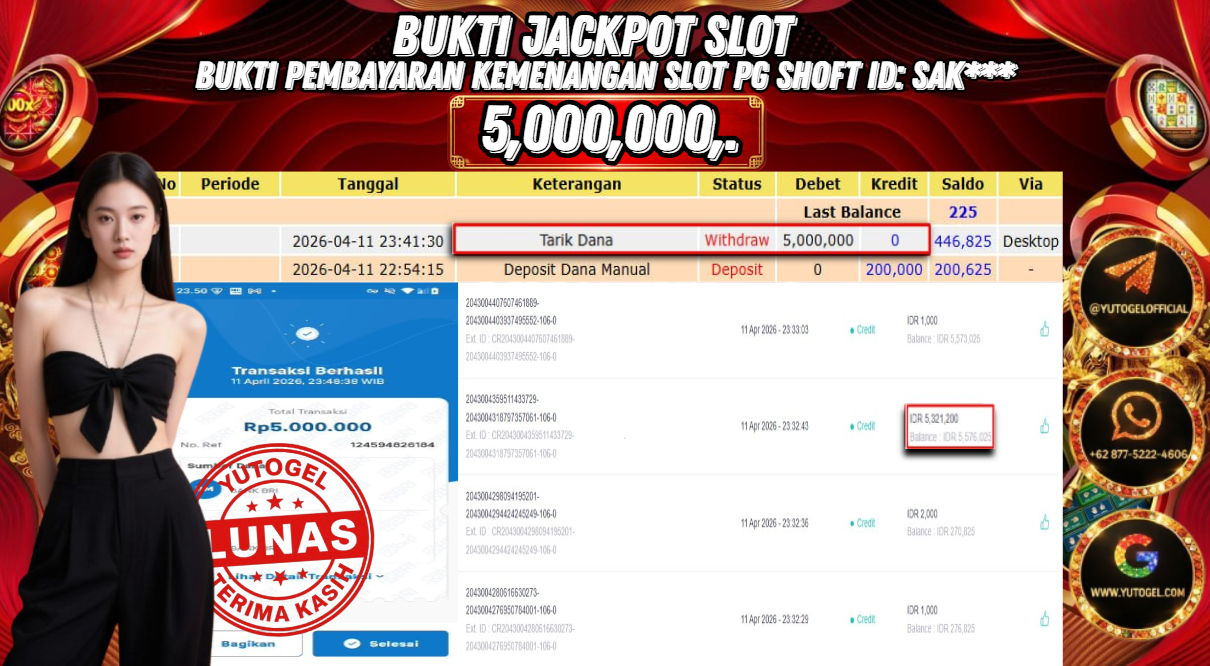 Selamat kepada USER ID : SAK*** Telah berhasil mendapatkan kemenangan besar pada YUTOGEL JACKPOT PG SHOFT MAHJONG WAYS2 RP. 5.000.000,. – LUNAS. Setelah mengisi formulir withdraw dengan kurung waktu hanya 5 – 10 menit pihak sudah melakukan transfer kepada pemilik User id dan dana sudah dapat dicairkan oleh pemenang. Bukti pembayaran yang kami berikan merupakan bukti pembayaran yang SAH/VALID yang langsung di dapatkan melalui tanda transfer transaksi dari Bank yang dituju.