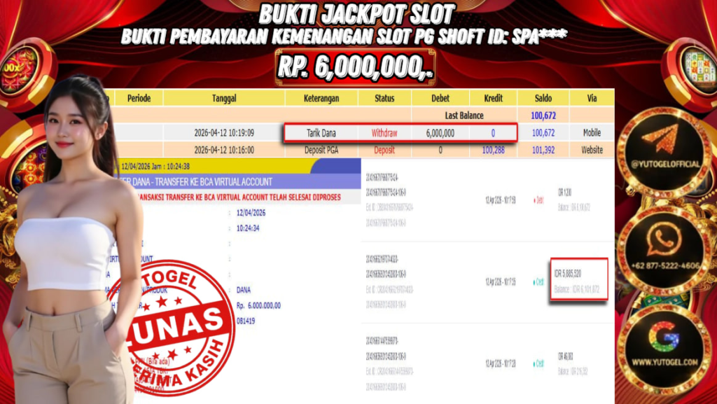 Selamat kepada USER ID : SPA*** Telah berhasil mendapatkan kemenangan besar pada YUTOGEL JACKPOT PG SHOFT MAHJONG WAYS2 RP. 6.000.000,. – LUNAS. Setelah mengisi formulir withdraw dengan kurung waktu hanya 5 – 10 menit pihak sudah melakukan transfer kepada pemilik User id dan dana sudah dapat dicairkan oleh pemenang. Bukti pembayaran yang kami berikan merupakan bukti pembayaran yang SAH/VALID yang langsung di dapatkan melalui tanda transfer transaksi dari Bank yang dituju.