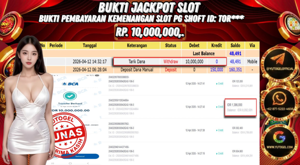 Selamat kepada USER ID : TOR*** Telah berhasil mendapatkan kemenangan besar pada YUTOGEL JACKPOT PG SHOFT WILD BOUNTY SHOWDOWN RP. 10.000.000,. – LUNAS. Setelah mengisi formulir withdraw dengan kurung waktu hanya 5 – 10 menit pihak sudah melakukan transfer kepada pemilik User id dan dana sudah dapat dicairkan oleh pemenang. Bukti pembayaran yang kami berikan merupakan bukti pembayaran yang SAH/VALID yang langsung di dapatkan melalui tanda transfer transaksi dari Bank yang dituju.