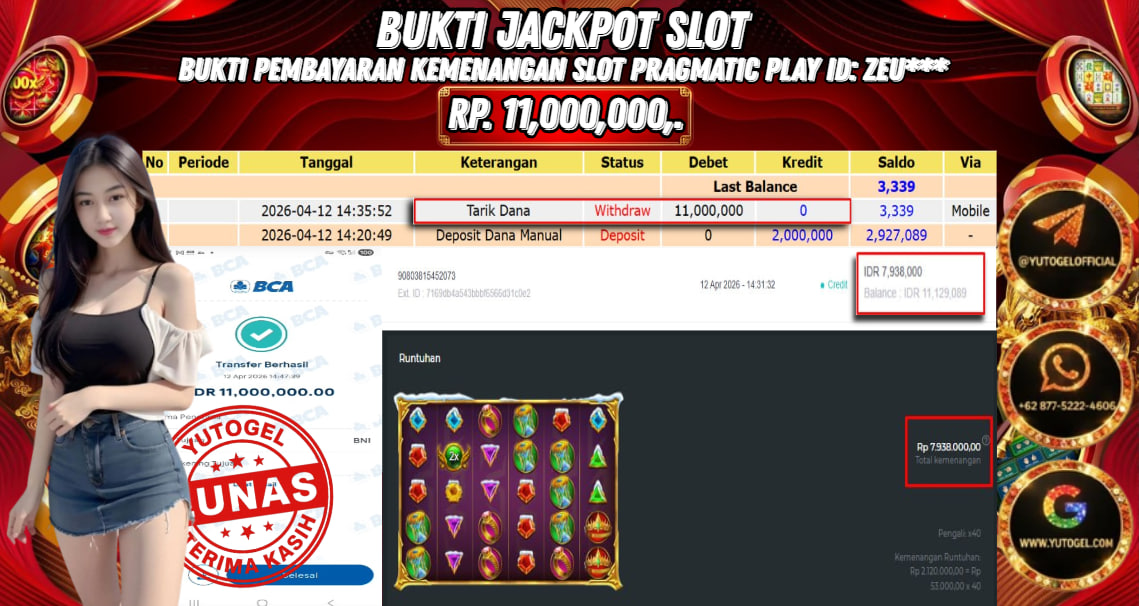Selamat kepada USER ID : ZEU*** Telah berhasil mendapatkan kemenangan besar pada YUTOGEL JACKPOT PRAGMATIC PLAY GATES OF OLYMPUS XMAS 1000 RP. 11.000.000,. – LUNAS. Setelah mengisi formulir withdraw dengan kurung waktu hanya 5 – 10 menit pihak sudah melakukan transfer kepada pemilik User id dan dana sudah dapat dicairkan oleh pemenang. Bukti pembayaran yang kami berikan merupakan bukti pembayaran yang SAH/VALID yang langsung di dapatkan melalui tanda transfer transaksi dari Bank yang dituju.