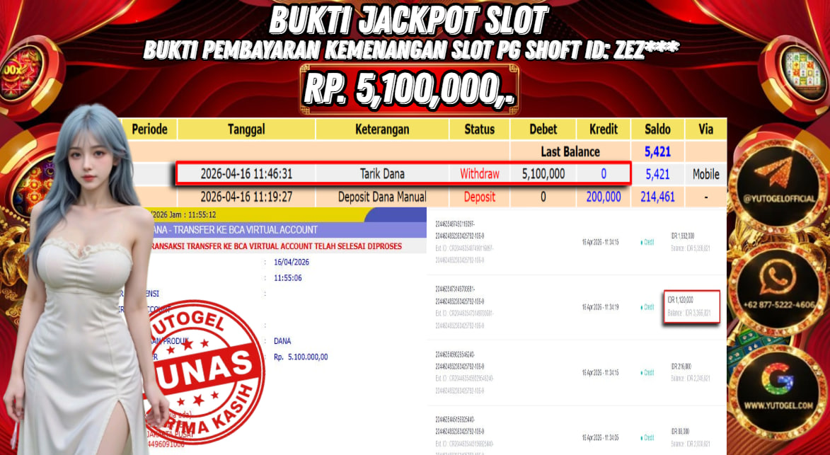 Selamat kepada USER ID : ZEZ*** Telah berhasil mendapatkan kemenangan besar pada YUTOGEL JACKPOT PG SHOFT MAHJONG WAYS2 RP. 5.100.000,. – LUNAS. Setelah mengisi formulir withdraw dengan kurung waktu hanya 5 – 10 menit pihak  sudah melakukan transfer kepada pemilik User id dan dana sudah dapat dicairkan oleh pemenang. Bukti pembayaran yang kami berikan merupakan bukti pembayaran yang SAH/VALID yang langsung di dapatkan melalui tanda transfer transaksi dari Bank yang dituju.