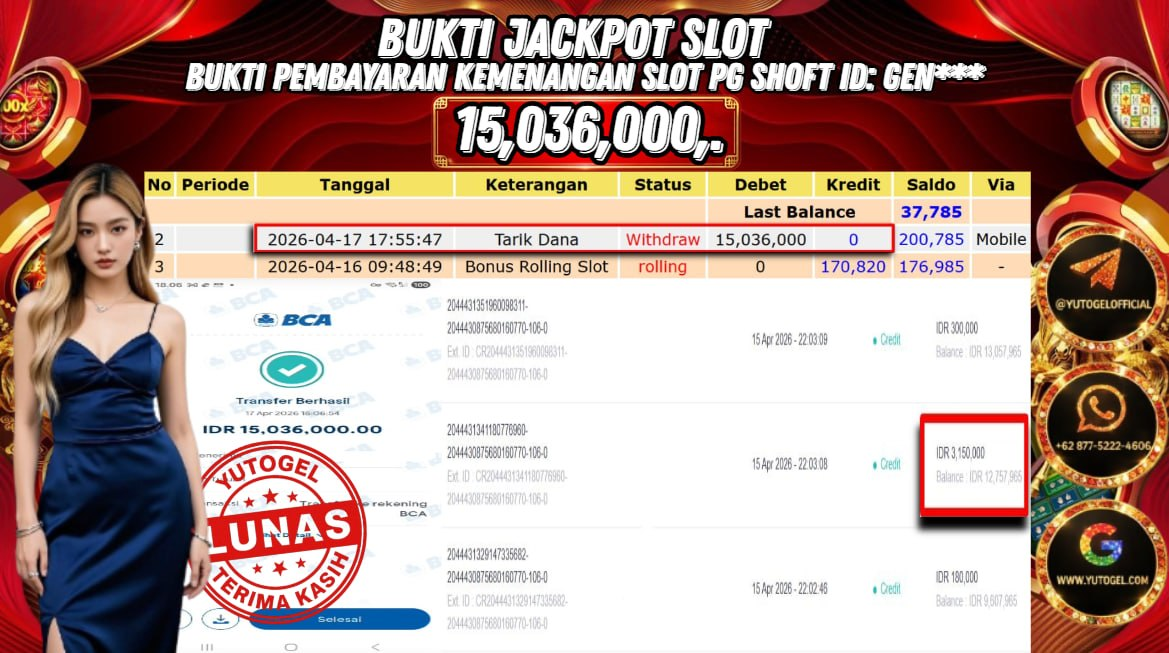 Selamat kepada USER ID : GEN*** Telah berhasil mendapatkan kemenangan besar pada YUTOGEL JACKPOT PG SHOFT MAHJONG WAYS RP. 15.036.000,. – LUNAS. Setelah mengisi formulir withdraw dengan kurung waktu hanya 5 – 10 menit pihak  sudah melakukan transfer kepada pemilik User id dan dana sudah dapat dicairkan oleh pemenang. Bukti pembayaran yang kami berikan merupakan bukti pembayaran yang SAH/VALID yang langsung di dapatkan melalui tanda transfer transaksi dari Bank yang dituju.
