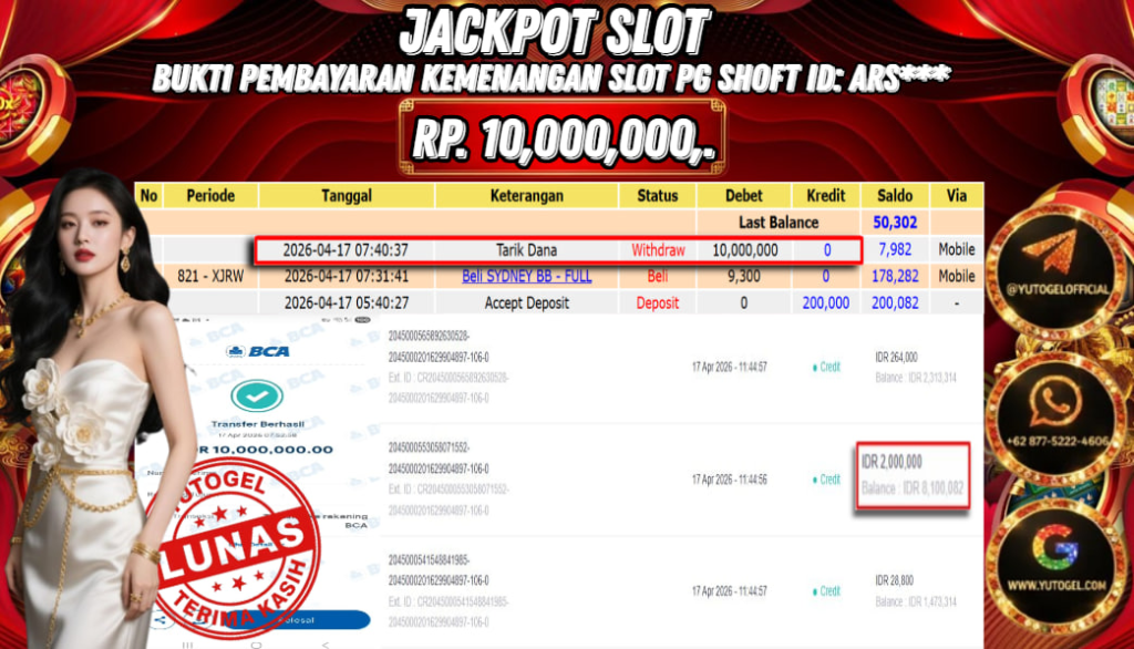 Selamat kepada USER ID : ARS*** Telah berhasil mendapatkan kemenangan besar pada YUTOGEL JACKPOT PG SHOFT WILD BOUNTY SHOWDOWN RP. 10.000.000,. – LUNAS. Setelah mengisi formulir withdraw dengan kurung waktu hanya 5 – 10 menit pihak  sudah melakukan transfer kepada pemilik User id dan dana sudah dapat dicairkan oleh pemenang. Bukti pembayaran yang kami berikan merupakan bukti pembayaran yang SAH/VALID yang langsung di dapatkan melalui tanda transfer transaksi dari Bank yang dituju.