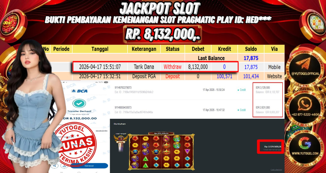 Selamat kepada USER ID : HED*** Telah berhasil mendapatkan kemenangan besar pada YUTOGEL JACKPOT PRAGMATIC PLAY GATES OF OLYMPUS1000 RP. 8.132.000,. – LUNAS. Setelah mengisi formulir withdraw dengan kurung waktu hanya 5 – 10 menit pihak  sudah melakukan transfer kepada pemilik User id dan dana sudah dapat dicairkan oleh pemenang. Bukti pembayaran yang kami berikan merupakan bukti pembayaran yang SAH/VALID yang langsung di dapatkan melalui tanda transfer transaksi dari Bank yang dituju.