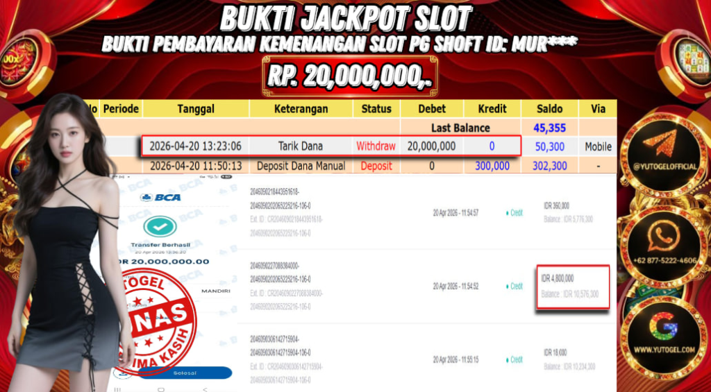 Selamat kepada USER ID : MUR*** Telah berhasil mendapatkan kemenangan besar pada YUTOGEL JACKPOT PG SHOFT MAHJONG WAYS RP. 20.000.000,. – LUNAS. Setelah mengisi formulir withdraw dengan kurung waktu hanya 5 – 10 menit pihak  sudah melakukan transfer kepada pemilik User id dan dana sudah dapat dicairkan oleh pemenang. Bukti pembayaran yang kami berikan merupakan bukti pembayaran yang SAH/VALID yang langsung di dapatkan melalui tanda transfer transaksi dari Bank yang dituju.