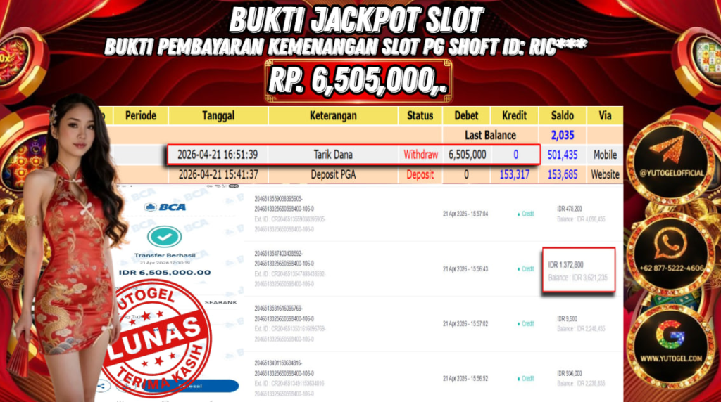 Selamat kepada USER ID : RIC*** Telah berhasil mendapatkan kemenangan besar pada YUTOGEL JACKPOT PG SHOFT MAHJONG WAYS RP. 6.505.000,. – LUNAS. Setelah mengisi formulir withdraw dengan kurung waktu hanya 5 – 10 menit pihak sudah melakukan transfer kepada pemilik User id dan dana sudah dapat dicairkan oleh pemenang. Bukti pembayaran yang kami berikan merupakan bukti pembayaran yang SAH/VALID yang langsung di dapatkan melalui tanda transfer transaksi dari Bank yang dituju.