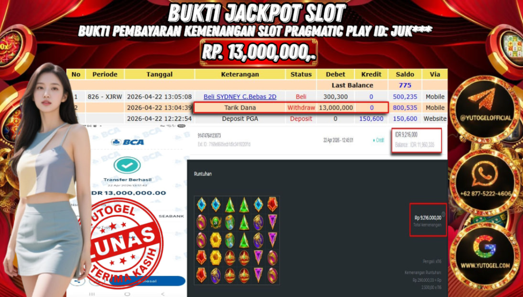 Selamat kepada USER ID : JUK*** Telah berhasil mendapatkan kemenangan besar pada YUTOGEL JACKPOT PRAGMATIC PLAY GATES OF OLYMPUS1000 RP. 13.000.000,. – LUNAS. Setelah mengisi formulir withdraw dengan kurung waktu hanya 5 – 10 menit pihak sudah melakukan transfer kepada pemilik User id dan dana sudah dapat dicairkan oleh pemenang. Bukti pembayaran yang kami berikan merupakan bukti pembayaran yang SAH/VALID yang langsung di dapatkan melalui tanda transfer transaksi dari Bank yang dituju.