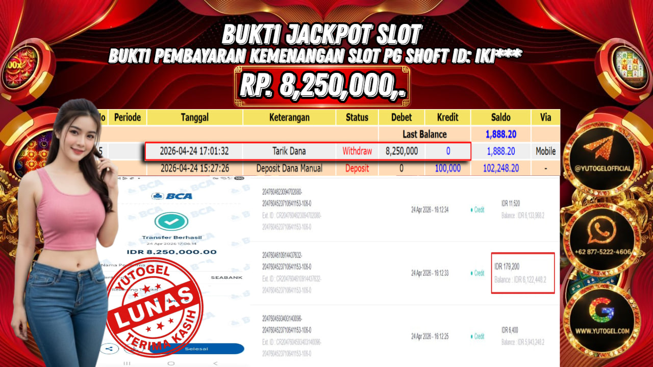 Selamat kepada USER ID : IKI*** Telah berhasil mendapatkan kemenangan besar pada YUTOGEL JACKPOT PG SHOFT MAHJONG WAYS RP. 8.250.000,. – LUNAS. Setelah mengisi formulir withdraw dengan kurung waktu hanya 5 – 10 menit pihak sudah melakukan transfer kepada pemilik User id dan dana sudah dapat dicairkan oleh pemenang. Bukti pembayaran yang kami berikan merupakan bukti pembayaran yang SAH/VALID yang langsung di dapatkan melalui tanda transfer transaksi dari Bank yang dituju.
