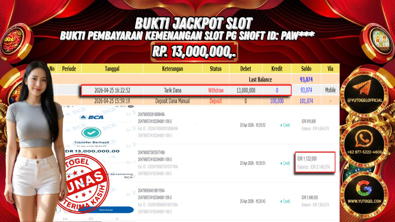 Selamat kepada USER ID : PAW*** Telah berhasil mendapatkan kemenangan besar pada YUTOGEL JACKPOT PG SHOFT WILD BOUNTY SHOWDOWN RP. 13.000.000,. – LUNAS. Setelah mengisi formulir withdraw dengan kurung waktu hanya 5 – 10 menit pihak sudah melakukan transfer kepada pemilik User id dan dana sudah dapat dicairkan oleh pemenang. Bukti pembayaran yang kami berikan merupakan bukti pembayaran yang SAH/VALID yang langsung di dapatkan melalui tanda transfer transaksi dari Bank yang dituju.