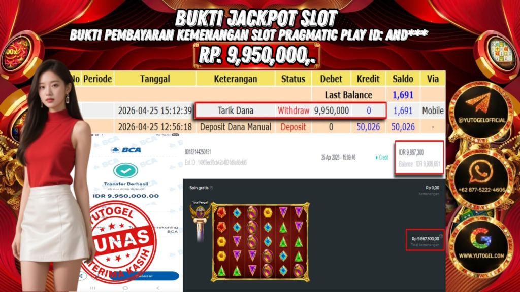 Selamat kepada USER ID : AND*** Telah berhasil mendapatkan kemenangan besar pada YUTOGEL JACKPOT PRAGMATIC PLAY GATES OF OLYMPUS1000 RP. 9.950.000,. – LUNAS. Setelah mengisi formulir withdraw dengan kurung waktu hanya 5 – 10 menit pihak sudah melakukan transfer kepada pemilik User id dan dana sudah dapat dicairkan oleh pemenang. Bukti pembayaran yang kami berikan merupakan bukti pembayaran yang SAH/VALID yang langsung di dapatkan melalui tanda transfer transaksi dari Bank yang dituju.