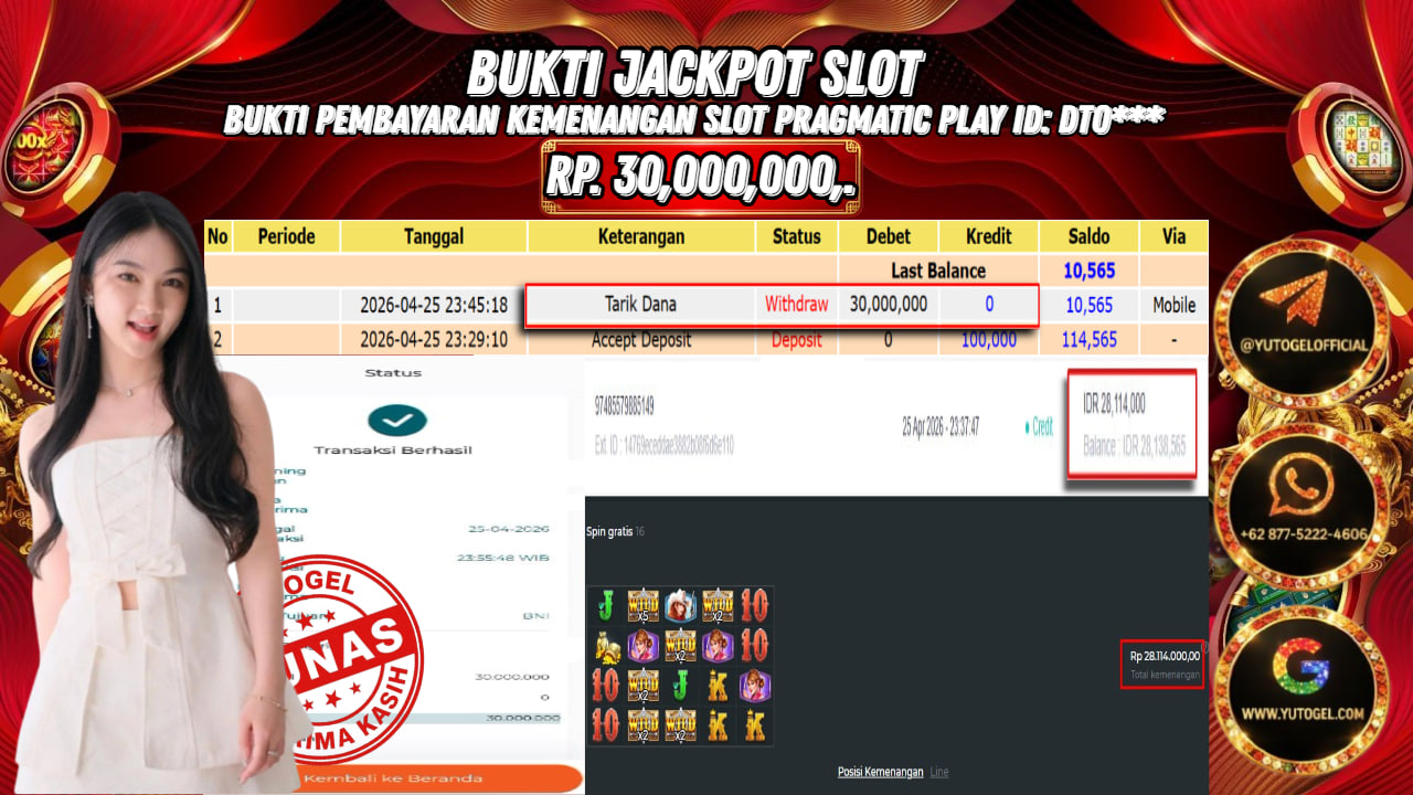 Selamat kepada USER ID : DTO*** Telah berhasil mendapatkan kemenangan besar pada YUTOGEL JACKPOT PRAGMATIC PLAY WILD WEST GOLD RP. 30.000.000,. – LUNAS. Setelah mengisi formulir withdraw dengan kurung waktu hanya 5 – 10 menit pihak sudah melakukan transfer kepada pemilik User id dan dana sudah dapat dicairkan oleh pemenang. Bukti pembayaran yang kami berikan merupakan bukti pembayaran yang SAH/VALID yang langsung di dapatkan melalui tanda transfer transaksi dari Bank yang dituju.