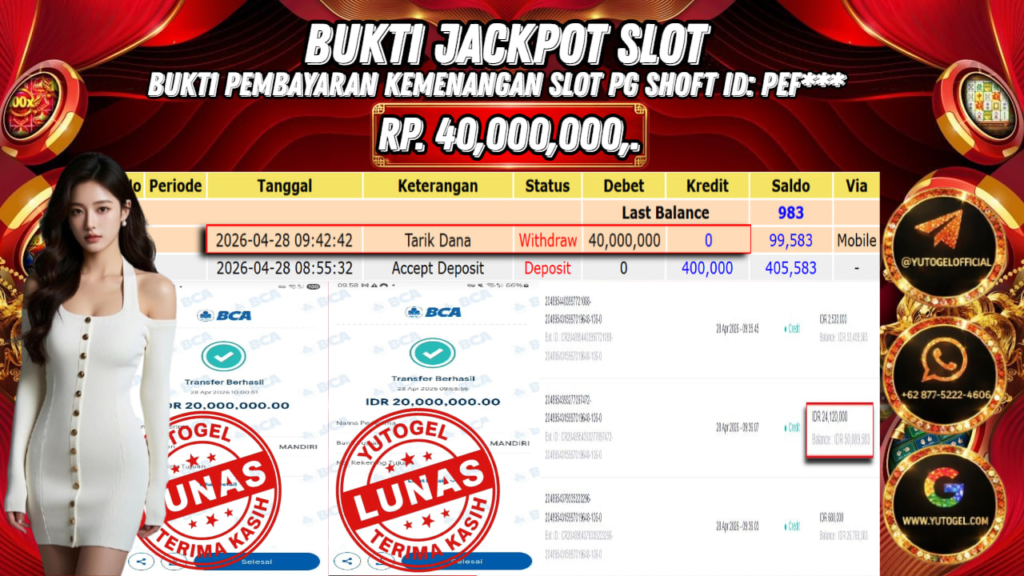 Selamat kepada USER ID : PEF*** Telah berhasil mendapatkan kemenangan besar pada YUTOGEL JACKPOT PG SHOFT WILD BOUNTY SHOWDOWN RP. 40.000.000,. – LUNAS. Setelah mengisi formulir withdraw dengan kurung waktu hanya 5 – 10 menit pihak  sudah melakukan transfer kepada pemilik User id dan dana sudah dapat dicairkan oleh pemenang. Bukti pembayaran yang kami berikan merupakan bukti pembayaran yang SAH/VALID yang langsung di dapatkan melalui tanda transfer transaksi dari Bank yang dituju.